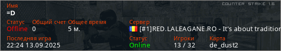 Играет на Counter Strike 1.6 сервере. Страна: РумынияПервый раз замечен 22:12 13.09.2025