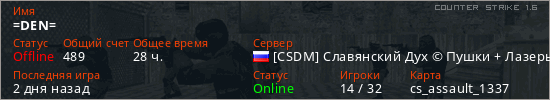 Играет на Counter Strike 1.6 сервере. Страна: РоссияПервый раз замечен 10:09 28.02.2024