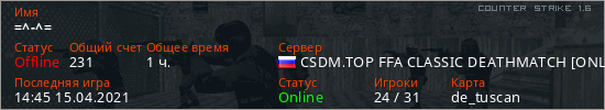 Играет на Counter Strike 1.6 сервере. Страна: РоссияПервый раз замечен 00:07 09.01.2020
