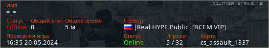 Играет на Counter Strike 1.6 сервере. Страна: РоссияПервый раз замечен 16:25 20.05.2024