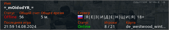 Играет на Counter Strike 1.6 сервере. Страна: РоссияПервый раз замечен 21:40 14.08.2024