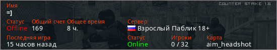 Играет на Counter Strike 1.6 сервере. Страна: РоссияПервый раз замечен 18:20 18.06.2020