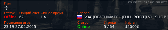 Играет на Counter Strike Source сервере. Страна: РоссияПервый раз замечен 23:43 11.01.2025