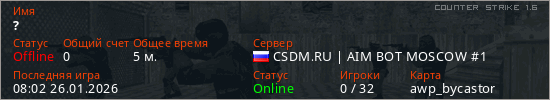 Играет на Counter Strike 1.6 сервере. Страна: РоссияПервый раз замечен 08:00 26.01.2026