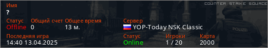 Играет на Counter Strike Source сервере. Страна: РоссияПервый раз замечен 15:32 21.07.2024