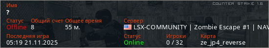 Играет на Counter Strike 1.6 сервере. Страна: СШАПервый раз замечен 04:16 09.11.2025