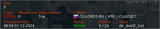 Играет на Counter Strike 1.6 сервере. Страна: РоссияПервый раз замечен 08:50 01.12.2024