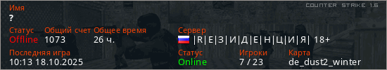 Играет на Counter Strike 1.6 сервере. Страна: РоссияПервый раз замечен 21:07 28.05.2019