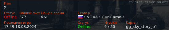 Играет на Counter Strike Source сервере. Страна: РоссияПервый раз замечен 12:08 30.06.2023