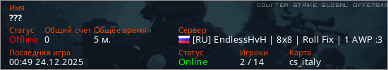 Играет на Counter Strike Global Offensive сервере. Страна: РоссияПервый раз замечен 00:47 24.12.2025