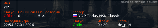 Играет на Counter Strike Source сервере. Страна: РоссияПервый раз замечен 22:29 27.01.2026