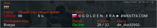 Последний раз был в сети Вчера Игрок с таким ником замечен на 68 серверах