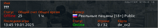 Играет на Counter Strike 1.6 сервере. Страна: РоссияПервый раз замечен 22:05 13.02.2023