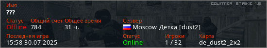 Играет на Counter Strike 1.6 сервере. Страна: РоссияПервый раз замечен 17:19 01.08.2020