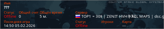 Играет на Counter Strike Global Offensive сервере. Страна: РоссияПервый раз замечен 14:48 05.02.2026