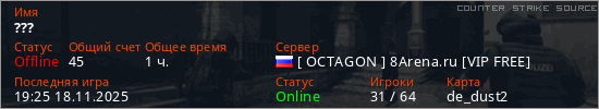 Играет на Counter Strike Source сервере. Страна: РоссияПервый раз замечен 11:15 26.04.2022
