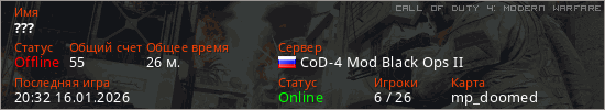 Играет на Call of Duty 4: Modern Warfare сервере. Страна: РоссияПервый раз замечен 22:03 02.05.2025