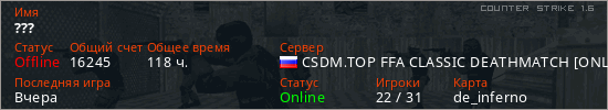 Играет на Counter Strike 1.6 сервере. Страна: РоссияПервый раз замечен 01:20 20.11.2019