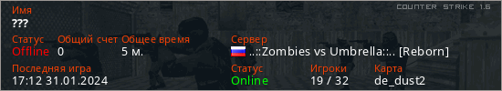 Играет на Counter Strike 1.6 сервере. Страна: РоссияПервый раз замечен 17:03 31.01.2024
