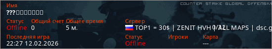 Играет на Counter Strike Global Offensive сервере. Страна: РоссияПервый раз замечен 22:25 12.02.2026