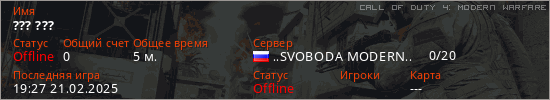 Играет на Call of Duty 4: Modern Warfare сервере. Страна: РоссияПервый раз замечен 19:23 21.02.2025