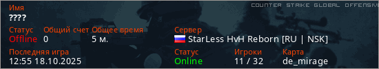 Играет на Counter Strike Global Offensive сервере. Страна: РоссияПервый раз замечен 12:53 18.10.2025