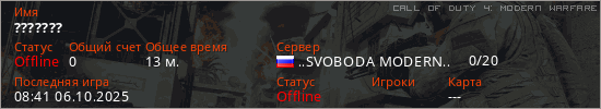 Играет на Call of Duty 4: Modern Warfare сервере. Страна: РоссияПервый раз замечен 08:17 24.09.2025
