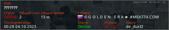Играет на Counter Strike 1.6 сервере. Страна: РоссияПервый раз замечен 04:14 21.08.2023