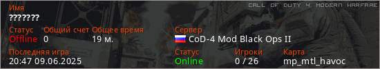 Играет на Call of Duty 4: Modern Warfare сервере. Страна: РоссияПервый раз замечен 19:47 29.12.2024