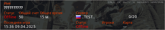 Играет на Call of Duty 4: Modern Warfare сервере. Страна: РоссияПервый раз замечен 14:04 08.04.2025