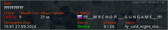 Последний раз был в сети 15:31 27.09.2024 Игрок с таким ником замечен на 20 серверах