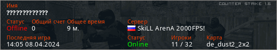 Играет на Counter Strike 1.6 сервере. Страна: РоссияПервый раз замечен 21:51 27.03.2024