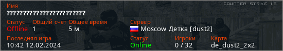 Играет на Counter Strike 1.6 сервере. Страна: РоссияПервый раз замечен 10:30 12.02.2024