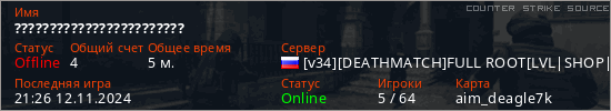 Играет на Counter Strike Source сервере. Страна: РоссияПервый раз замечен 21:11 12.11.2024