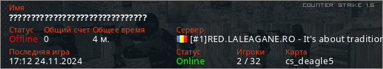 Играет на Counter Strike 1.6 сервере. Страна: РумынияПервый раз замечен 17:10 24.11.2024