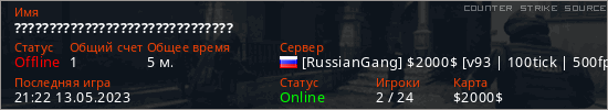 Играет на Counter Strike Source сервере. Страна: РоссияПервый раз замечен 21:20 13.05.2023