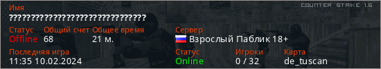 Играет на Counter Strike 1.6 сервере. Страна: РоссияПервый раз замечен 14:00 23.08.2022