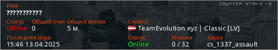 Играет на Counter Strike 1.6 сервере. Страна: ЛатвияПервый раз замечен 15:44 13.04.2025