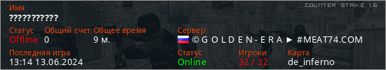 Играет на Counter Strike 1.6 сервере. Страна: РоссияПервый раз замечен 13:50 12.06.2024