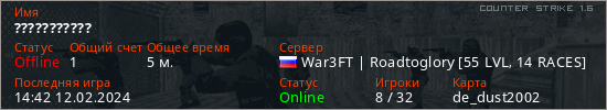 Играет на Counter Strike 1.6 сервере. Страна: РоссияПервый раз замечен 14:40 12.02.2024