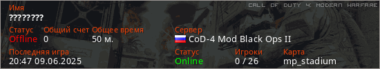 Играет на Call of Duty 4: Modern Warfare сервере. Страна: РоссияПервый раз замечен 17:37 12.11.2023