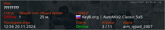 Играет на Counter Strike 1.6 сервере. Страна: РоссияПервый раз замечен 22:28 15.08.2024