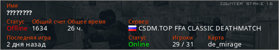 Последний раз был в сети 2 дня назад Игрок с таким ником замечен на 26 серверах