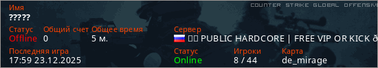 Играет на Counter Strike Global Offensive сервере. Страна: РоссияПервый раз замечен 17:47 23.12.2025