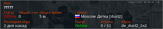 Играет на Counter Strike 1.6 сервере. Страна: РоссияПервый раз замечен 14:54 23.01.2026