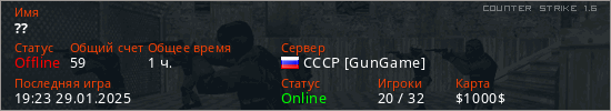 Играет на Counter Strike 1.6 сервере. Страна: РоссияПервый раз замечен 21:29 11.05.2023