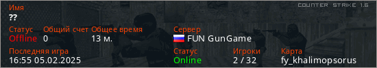 Играет на Counter Strike 1.6 сервере. Страна: РоссияПервый раз замечен 19:03 31.08.2024