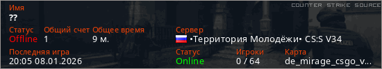 Играет на Counter Strike Source сервере. Страна: РоссияПервый раз замечен 20:35 07.01.2026