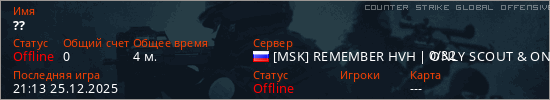 Играет на Counter Strike Global Offensive сервере. Страна: РоссияПервый раз замечен 21:05 25.12.2025