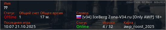 Играет на Counter Strike Source сервере. Страна: РоссияПервый раз замечен 15:50 20.10.2025